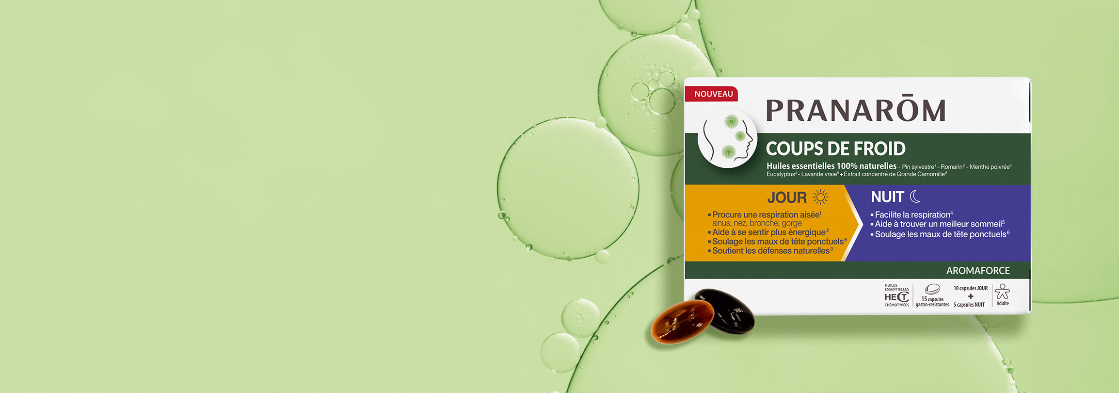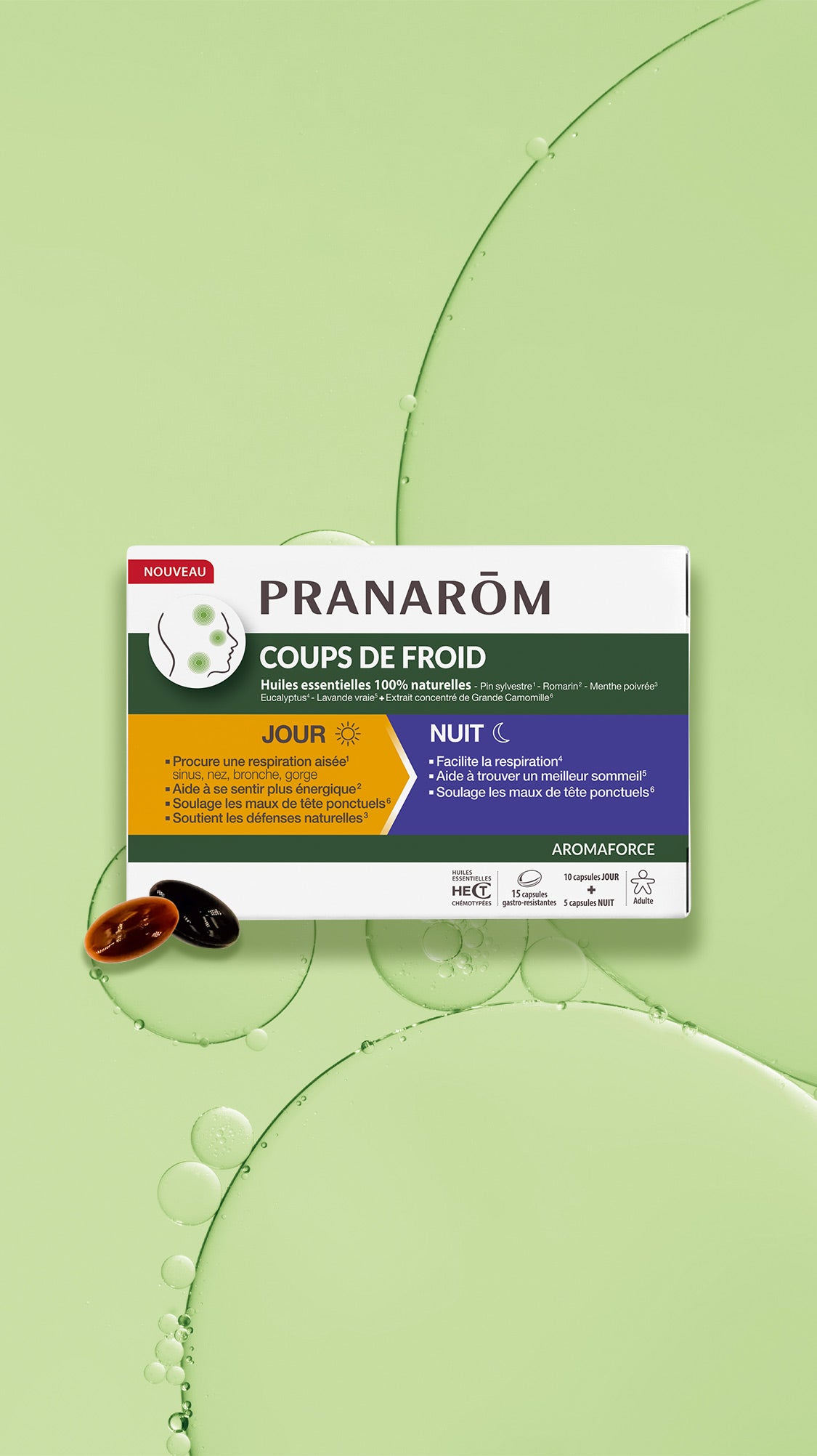Coups de Froid JOUR & NUIT est une solution naturelle à base d’Huiles Essentielles 100 % pures et naturelles pour soutenir le confort en cas de refroidissement. Grâce à une formule complète, ce duo contribue à une respiration aisée, aide à maintenir l’énergie le jour et favorise un sommeil de qualité la nuit.