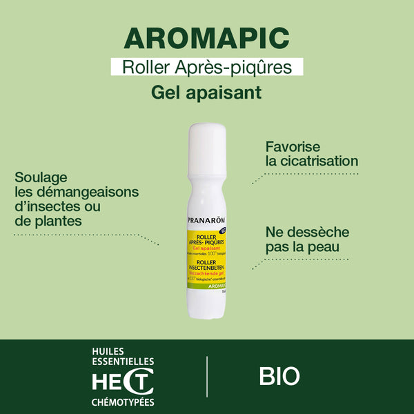 Following the insect bite, it is advisable to locally apply an essential oil such as lavender aspic or lemon eucalyptus. Before, make sure to dilute the essential oil in avegetable oil to avoid any skin irritation. For more extensive itching, it is possible to perform aaromatic bathwith a few drops of essential oil can bring general relief (this does not apply to all oils, check the compatibility of the product and the method beforehand).