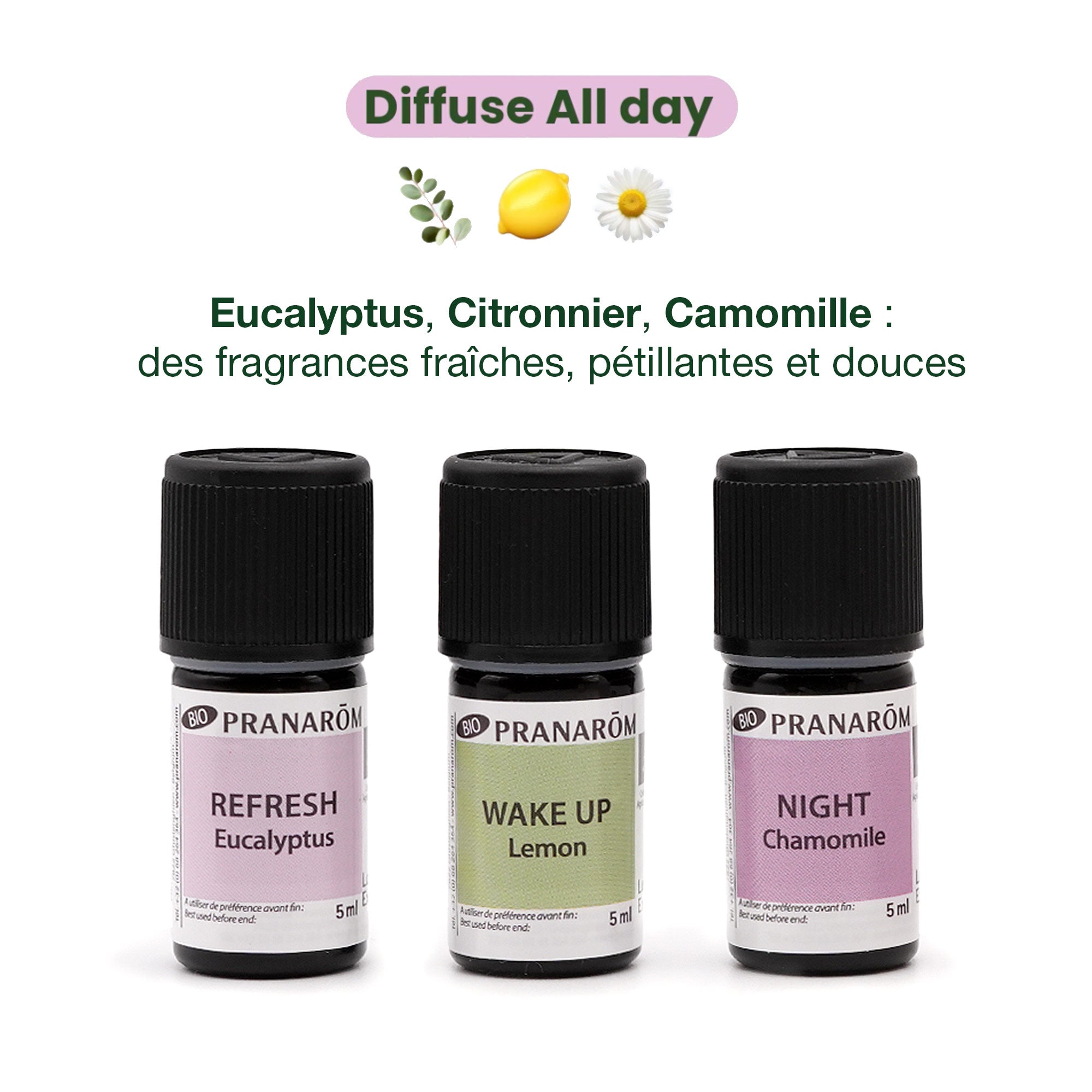 Réunit 3 synergies d’Huiles Essentielles prêtes à diffuser chez soi du matin au soir.