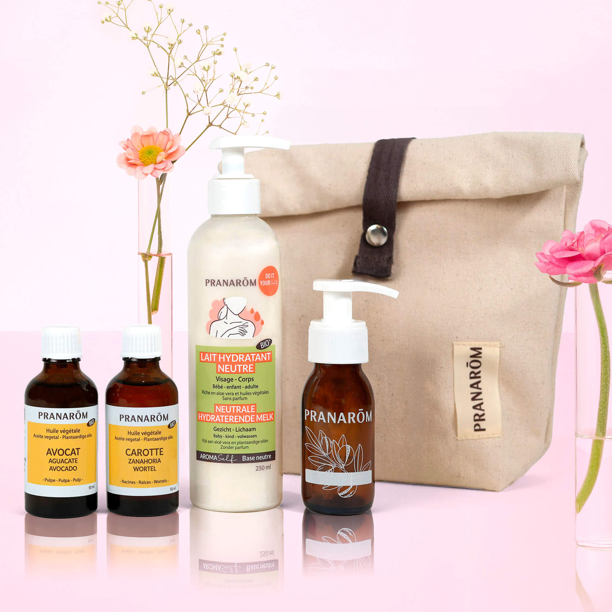 Préparez votre propre lait corporel nourrissant ou effet peau dorée grâce aux Huiles Végétales d’Avocat ou de Carotte combinées au Lait neutre hydratant selon vos envies et besoins. La trousse et le flacon pompe 60 ml sont offerts !