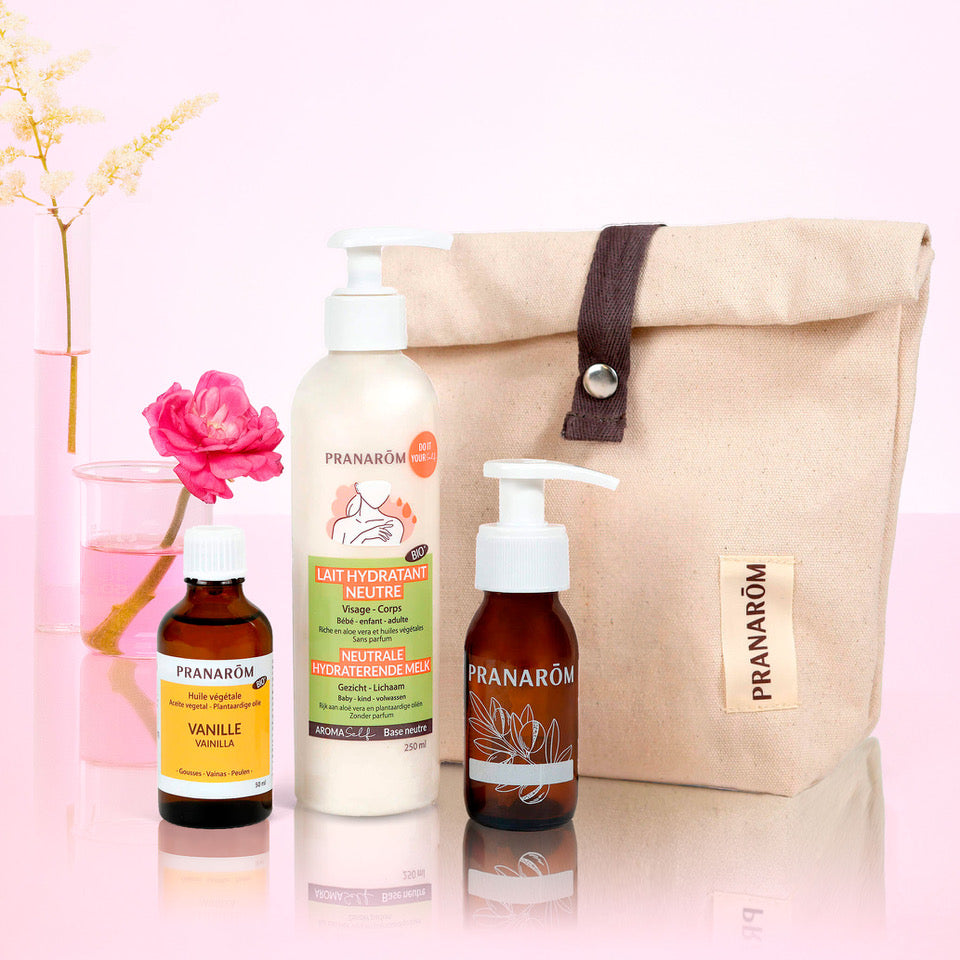 Lait démaquillant doux et réconfortant à l'Huile Végétale de Vanille et lait hydratant neutre. Trousse en coton BIO et flacon pompe offerts !